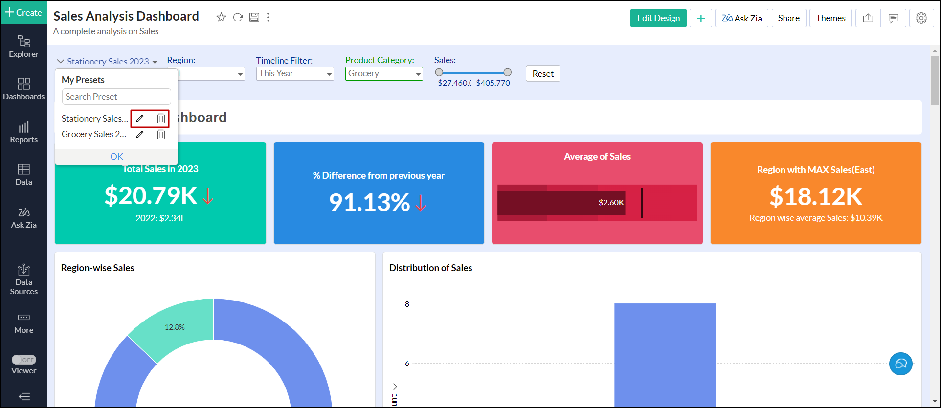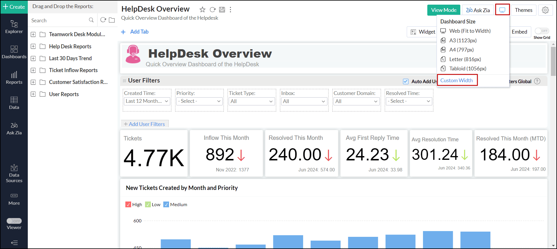 Analytics Plus enables you to customize the size of the dashboard based on your preference. This feature helps you present data more effectively by fitting visualizations to the screen width, minimizing clutter, and creating a more organized layout.
