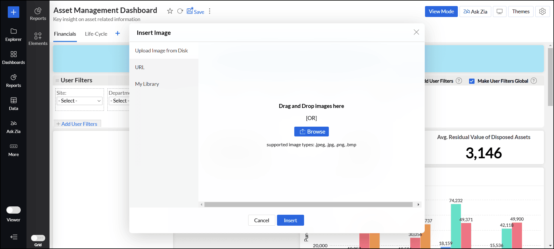 Analytics Plus allows you to add images and GIFs to your dashboard to enhance visual appeal and improve contextual understanding of your dashboard. To add an image/GIF to your dashboard,