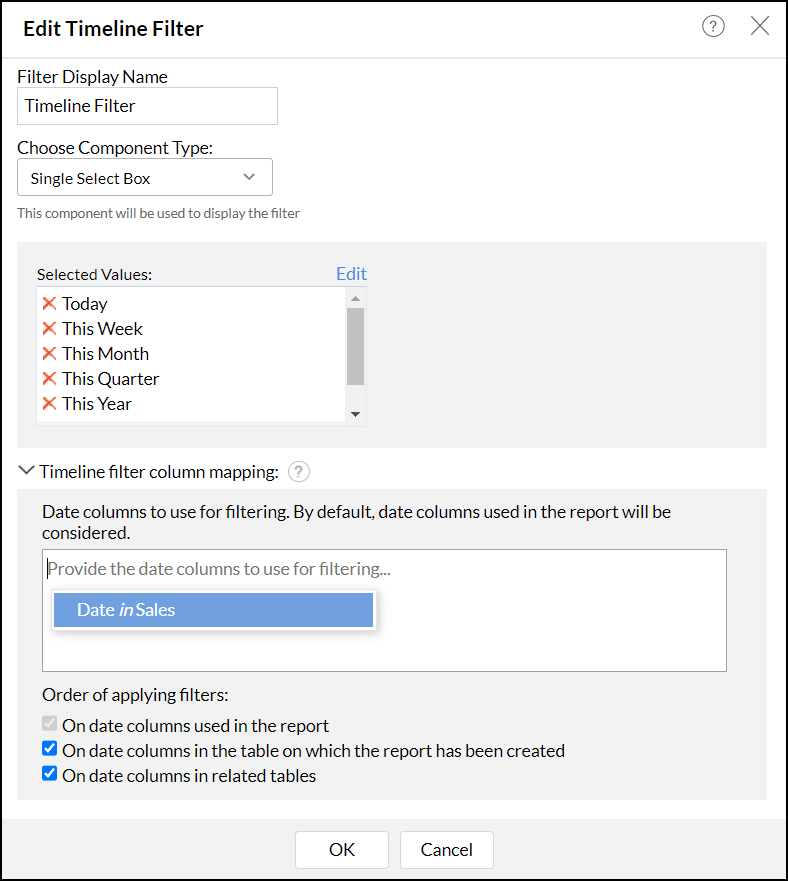 - On date columns in the table on which the report has been created: This option applies the timeline filters over date columns present in the reports' base tables, even if the reports do not contain a date column.