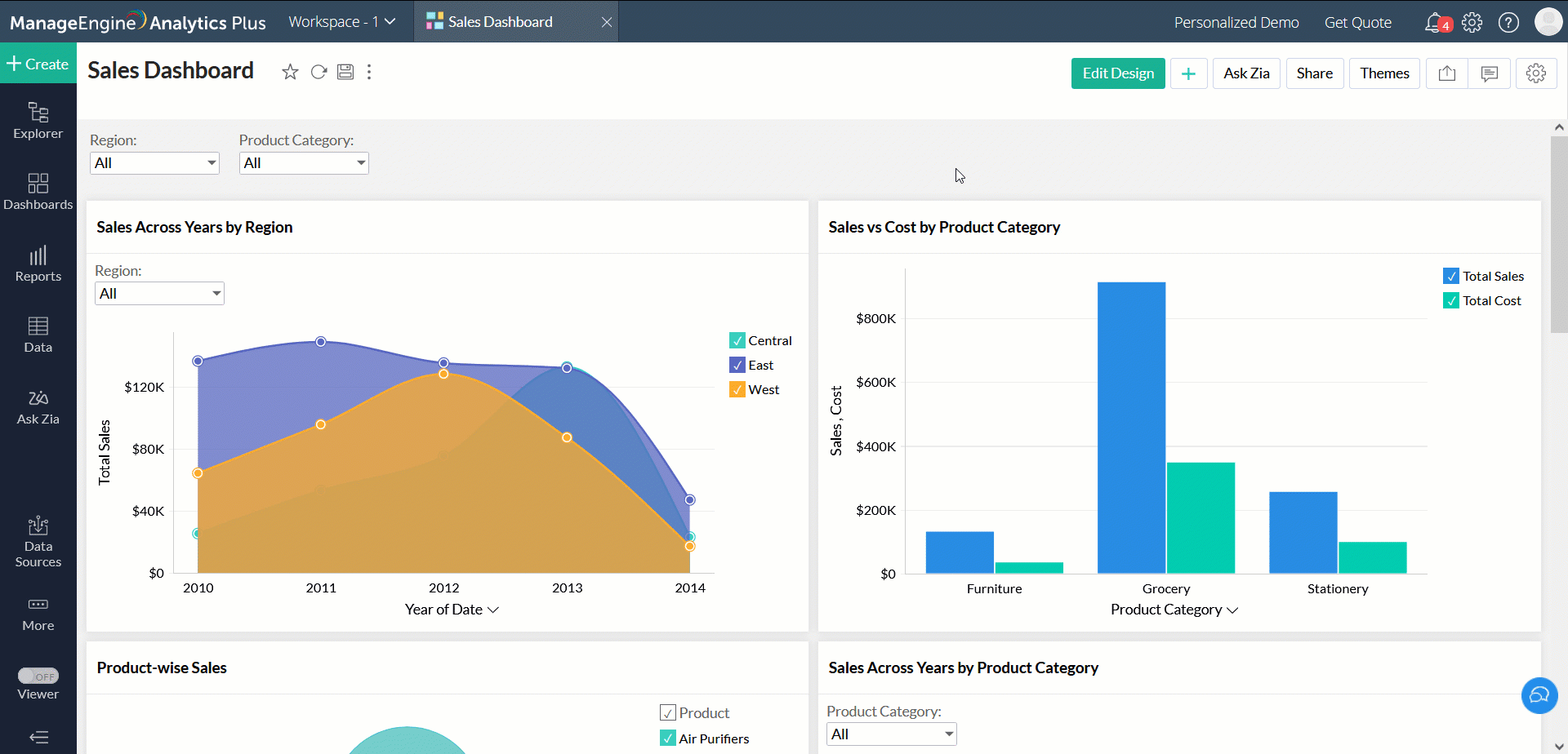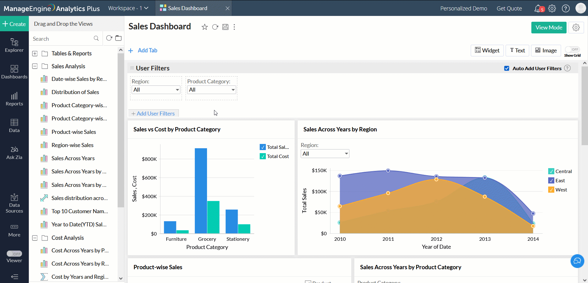 Dashboards allow you to combine multiple reports into a single page for a quick overview. ManageEngine Analytics Plus provides a simple and intuitive drag-and-drop interface to efficiently organize your dashboards as required. Drag-and-drop the reports, widgets, user filters, and rich-formatted text to create a visually rich and interactive dashboard.
