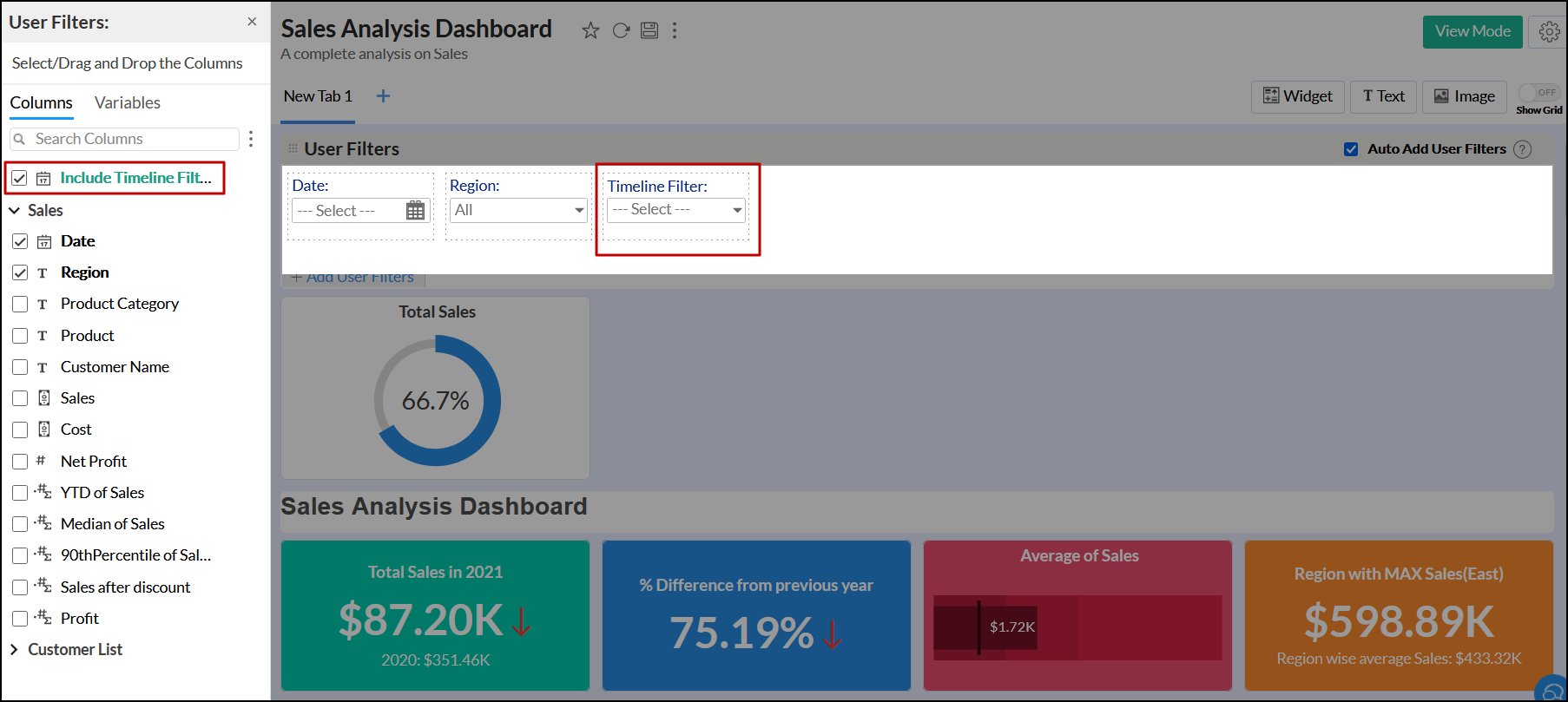 Analytics Plus allows you to automatically add a report's user filters to the dashboard. This is an easy and convenient way to add user filters to a dashboard, without having to create them again.