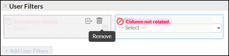 ManageEngine Analytics Plus will display an alert over a user filter column when you delete every report that uses this column from the dashboard. This helps you to identify user filters that are no longer relevant and remove them. Hover your mouse over the corresponding column and select Remove from the highlighted options. Please note that you will not be able to save the dashboard without removing it.
