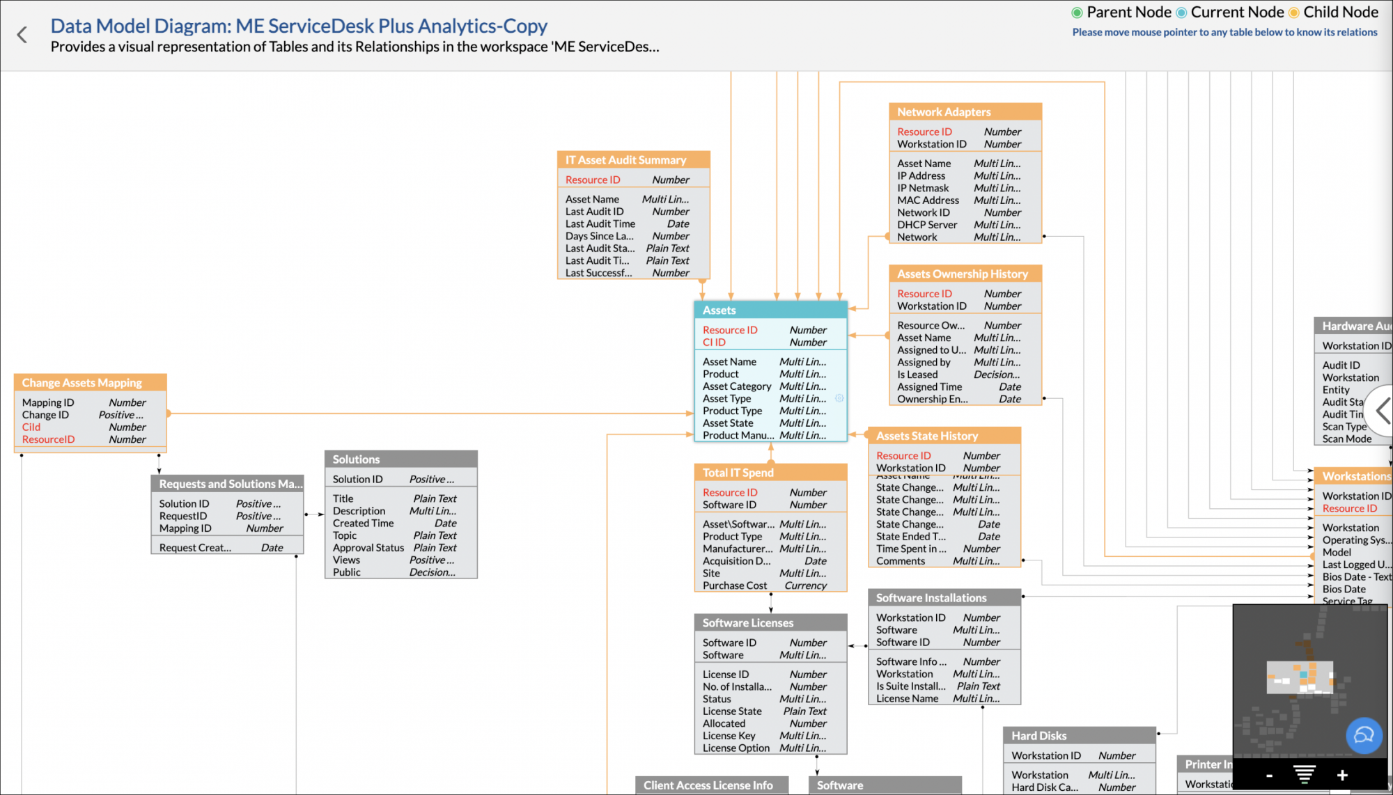 1. View all the tables available in the workspace and their relationship details.