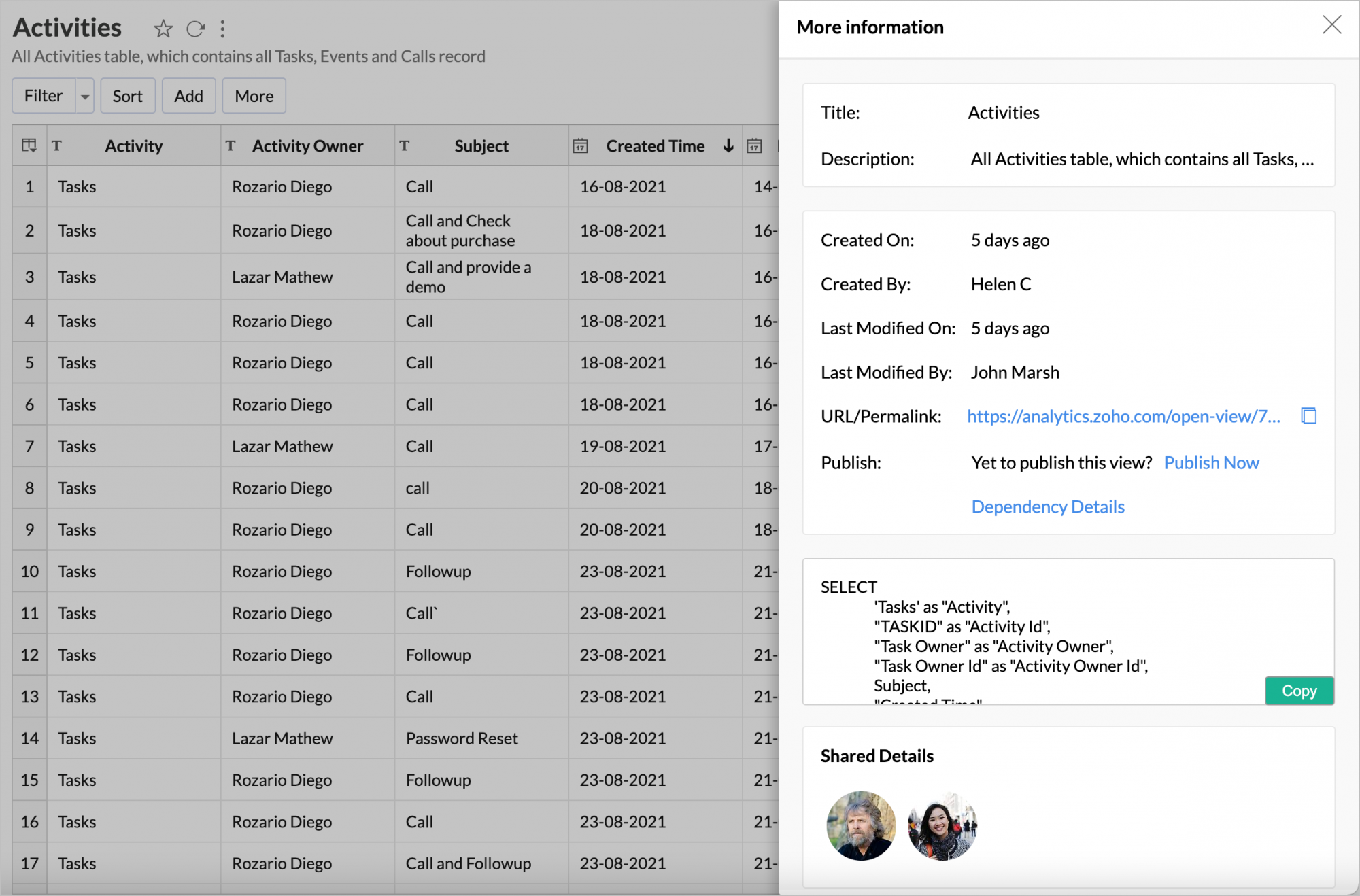 - The last section displays the Shared Details of the view. You can click the Edit icon to open the Existing Shared Details dialog and modify the share settings.