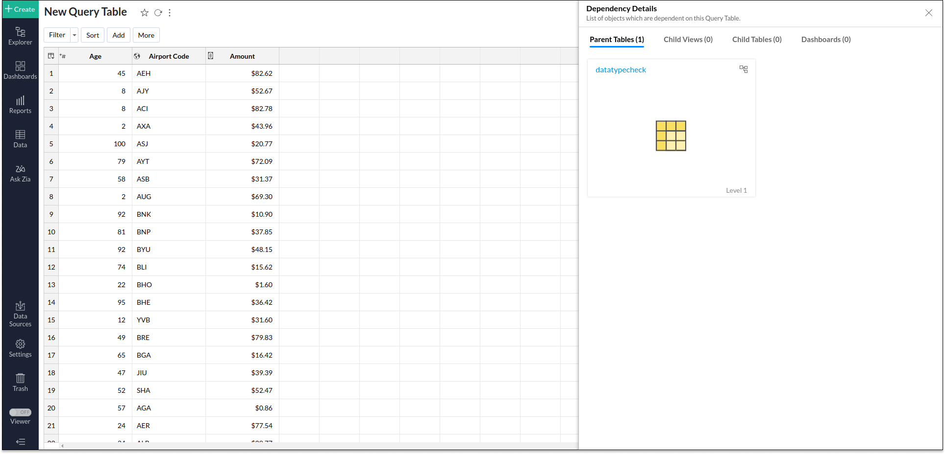 While viewing the dependency details of query tables in Analytics Plus, you can also view their level of dependency. Follow the steps below to access a query table's dependency details.