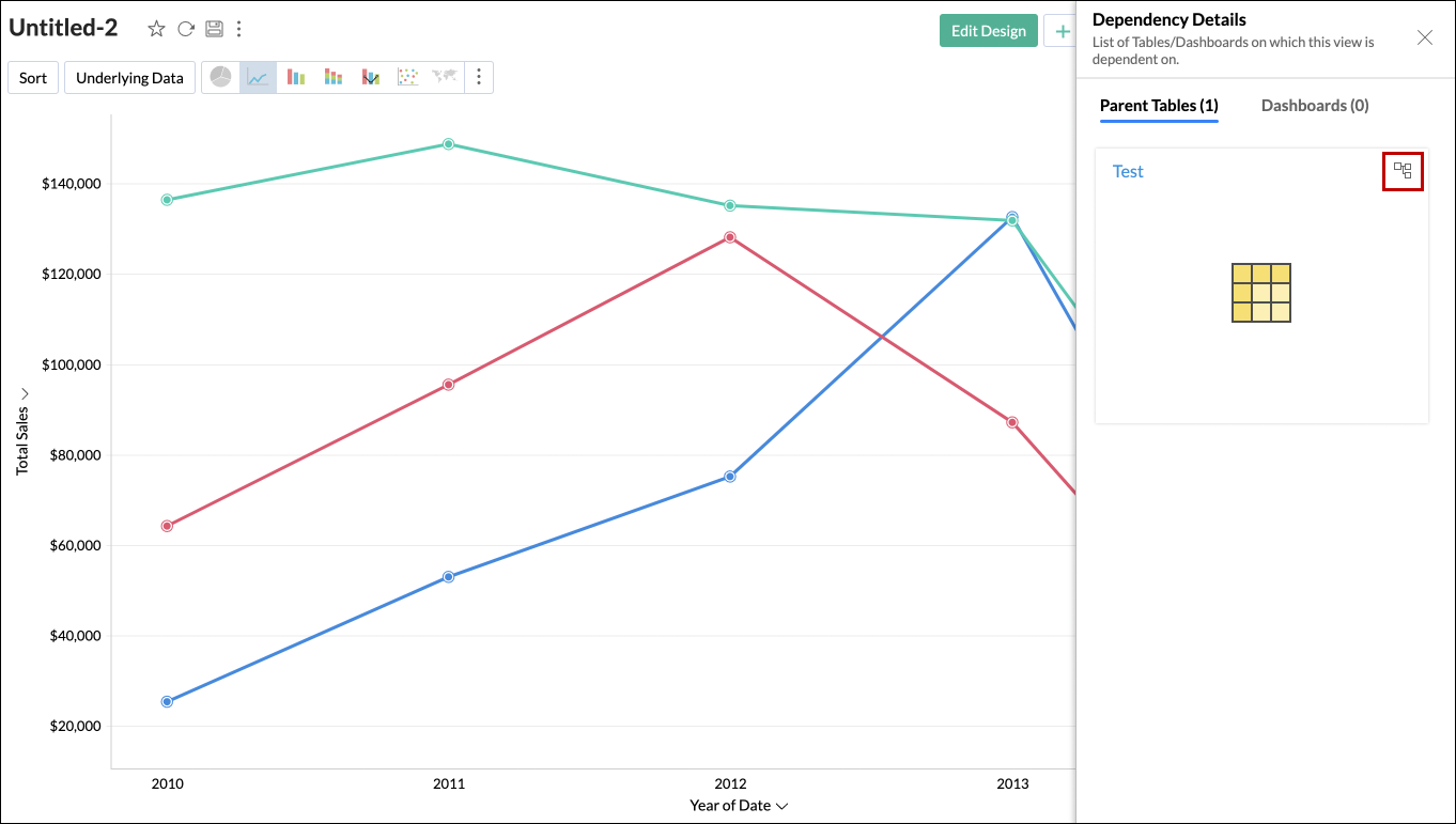The multiple-level parent tables and child tables will be listed. Additionally, all the dashboards in which it is embedded will also be listed.