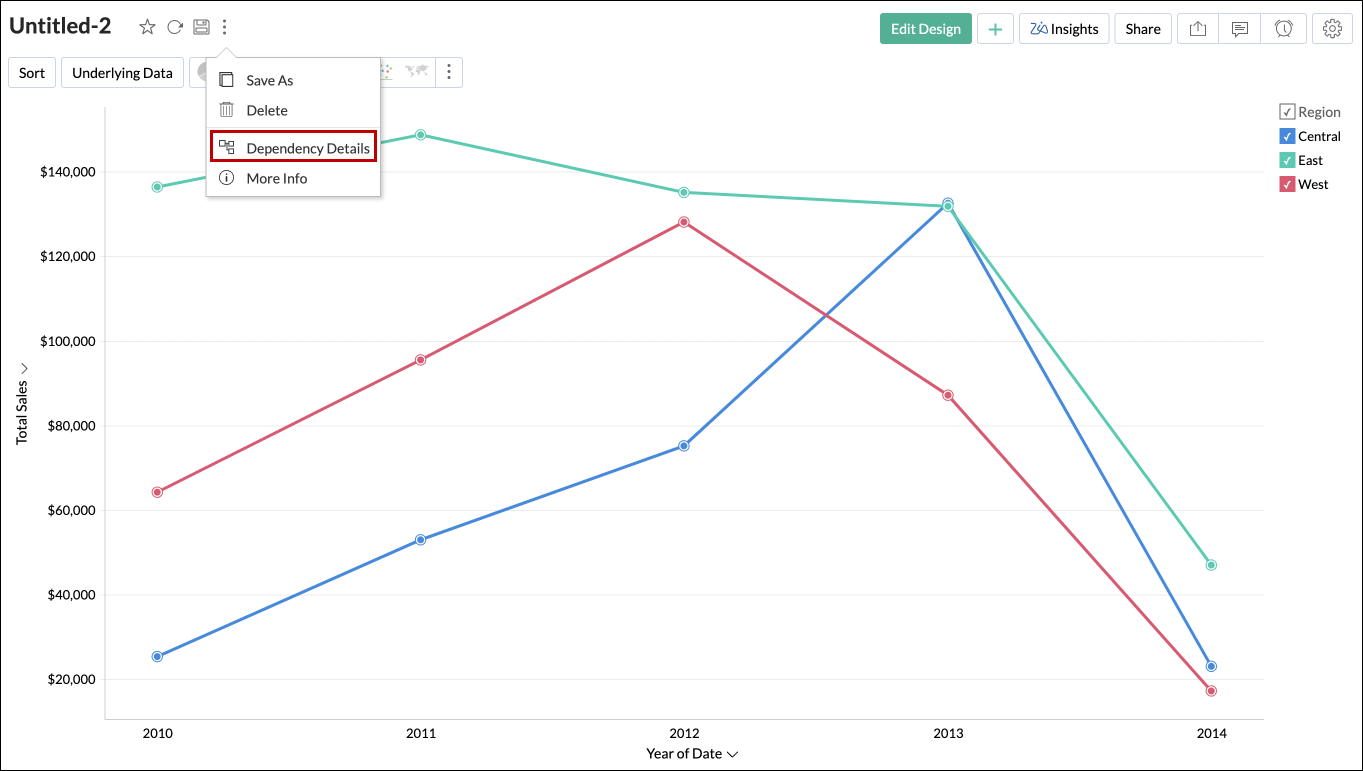 Open the required report, click the More icon, and select the Dependency Details option.