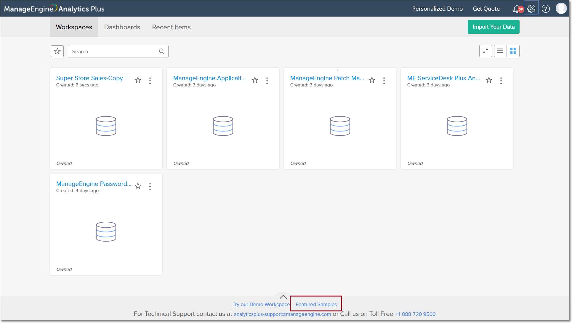 Analytics Plus provides a set of featured sample workspaces, to facilitate a better understanding of the features offered. To access these workspaces, click the Featured Samples button at the bottom of the Analytics Plus homepage.
