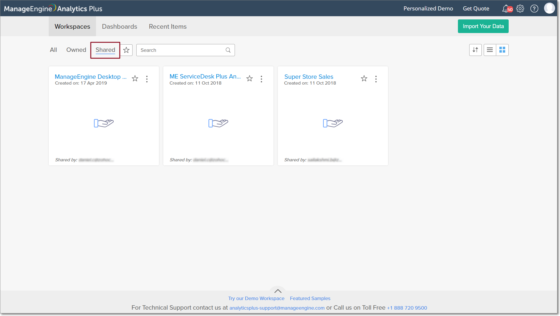To view the workspaces that have been shared with you, navigate to the Workspaces section of the Analytics Plus homepage, and click the Shared button. This lists the shared workspaces, along with the details of the workspace owner.