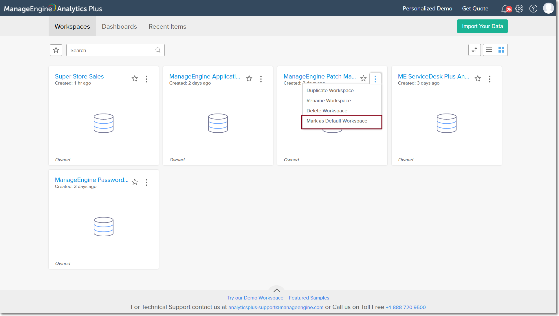 Setting a default workspace ensures that the workspace will be opened when accessing Analytics Plus. Follow the steps below to set a workspace as default in Analytics Plus.