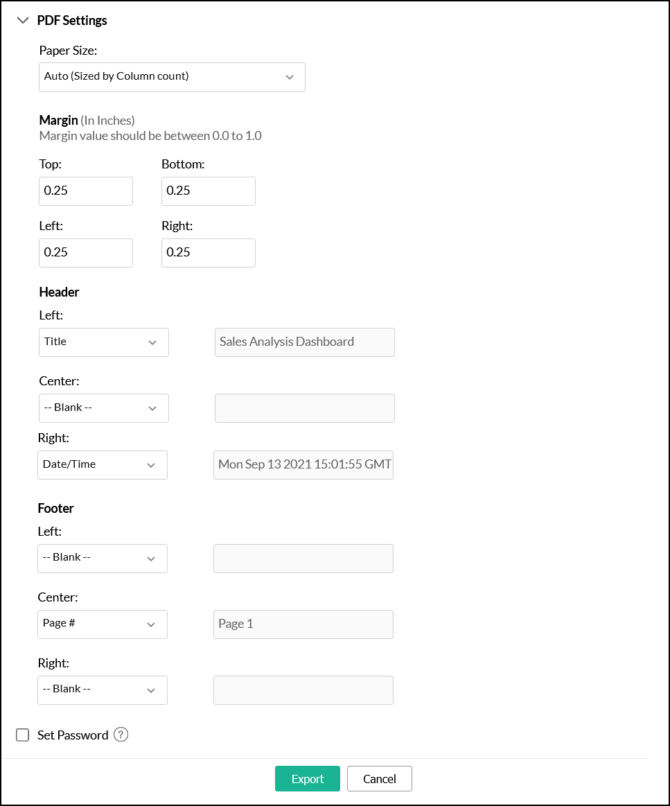 12. Select the Set Password checkbox to protect your exported file with passwords. The specified password has to be shared with all intended recipients separately, as Analytics Plus does not offer options to share your password through the application interface.