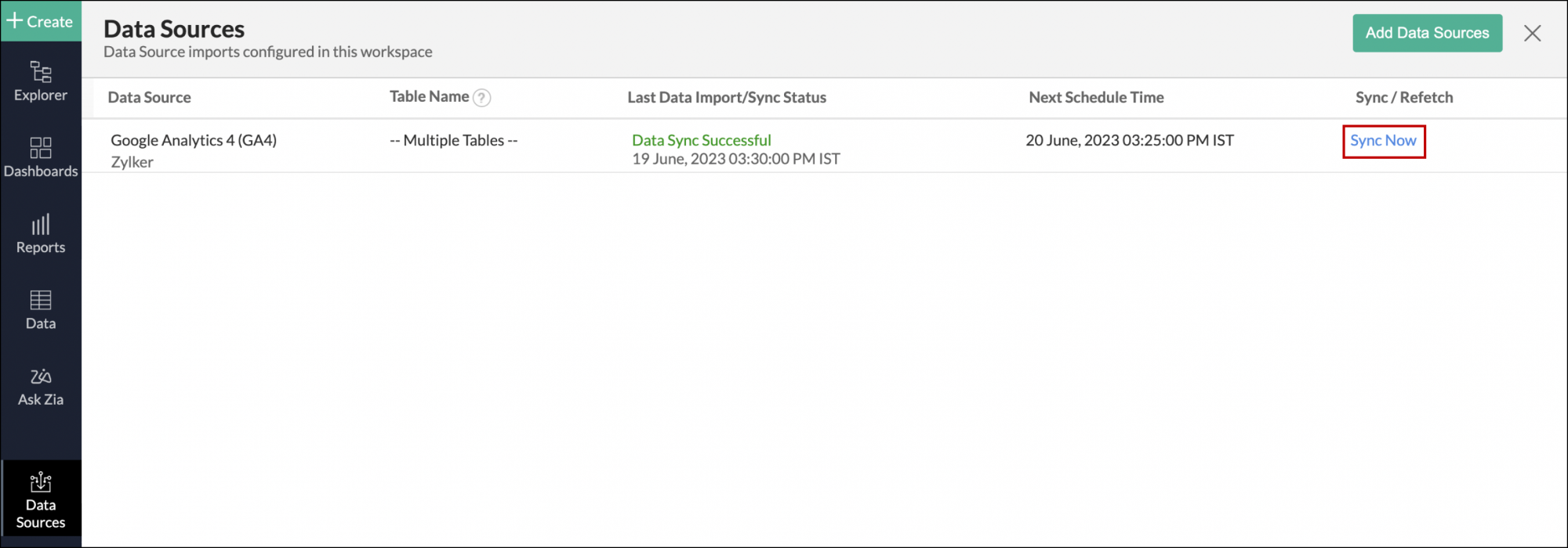 - Open the required workspace, and click the Data Sources option from the side panel.
