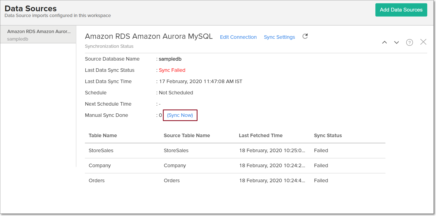 If you have created reports in Analytics Plus over columns or tables that don't have a direct mapping to the data in the database, mismatches will occur. These mismatches will be listed in the Cloud Database Connection Settings page, which can be accessed by clicking the Data Sources button from the side panel. Refer the following question to know more.