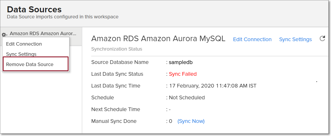 Note: Removing the data source does not delete the corresponding tables and reports from Analytics Plus. However, further synchronization cannot be carried out.