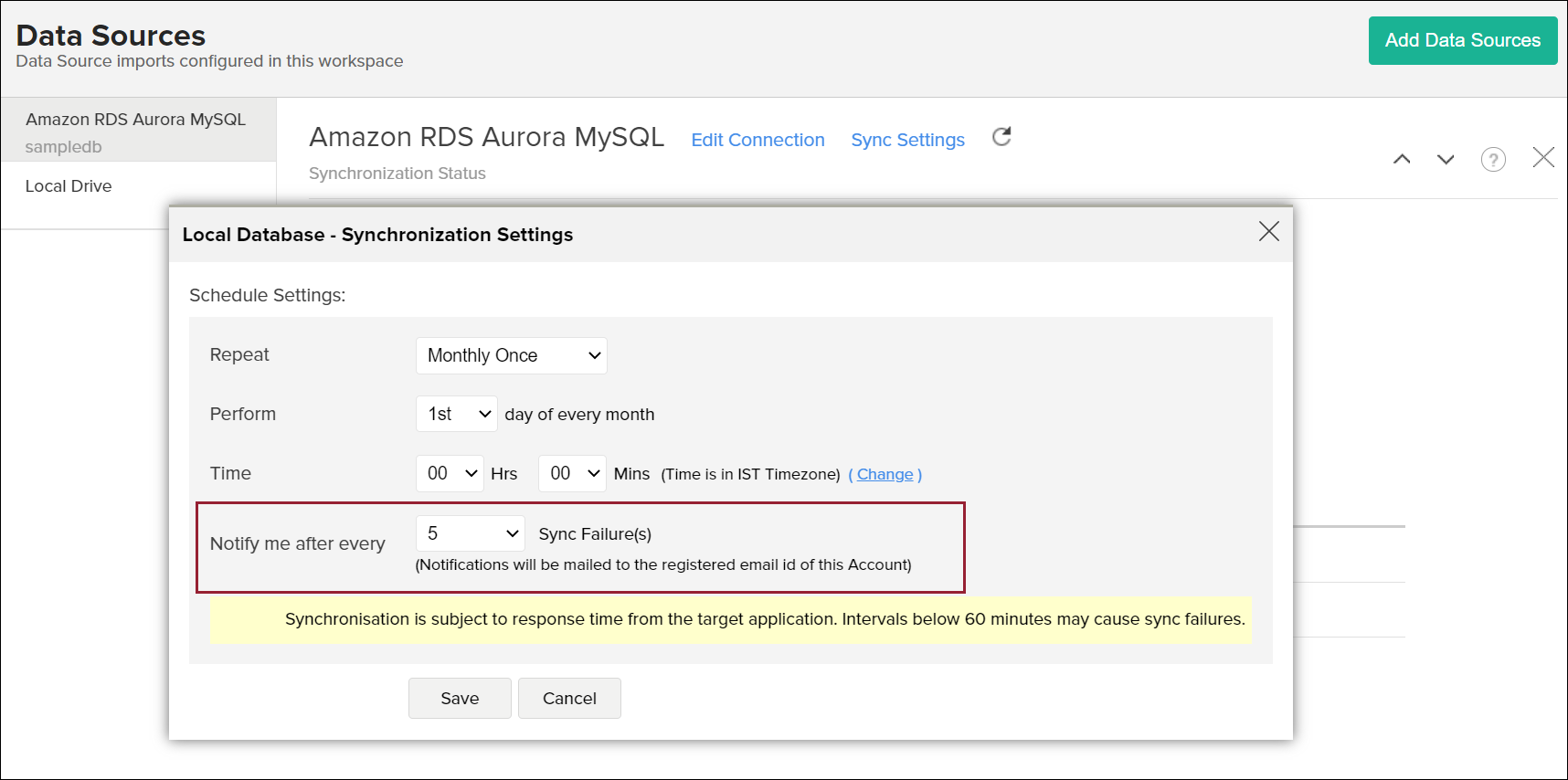 Specify the number of consecutive import failure after which you are to be notified in the Notify me after every 'N' Sync Failure (s) section.