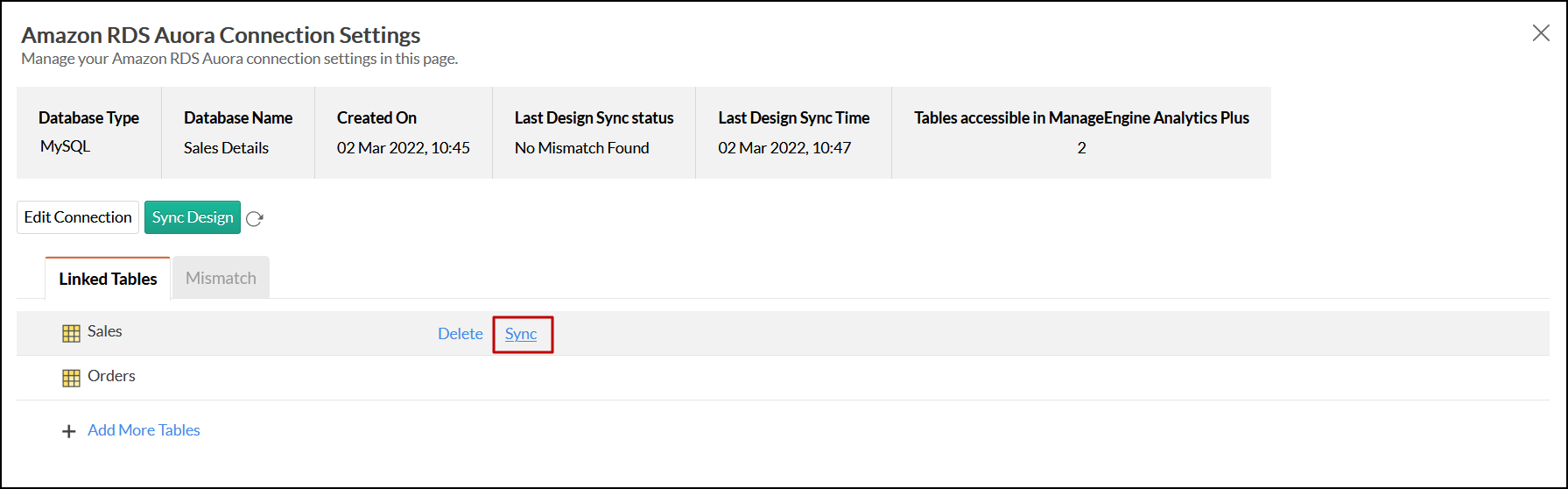 Note: If there are any mismatches, you will not be able to add new tables. The mismatches need to be resolved first. Click here to know more about resolving mismatches.