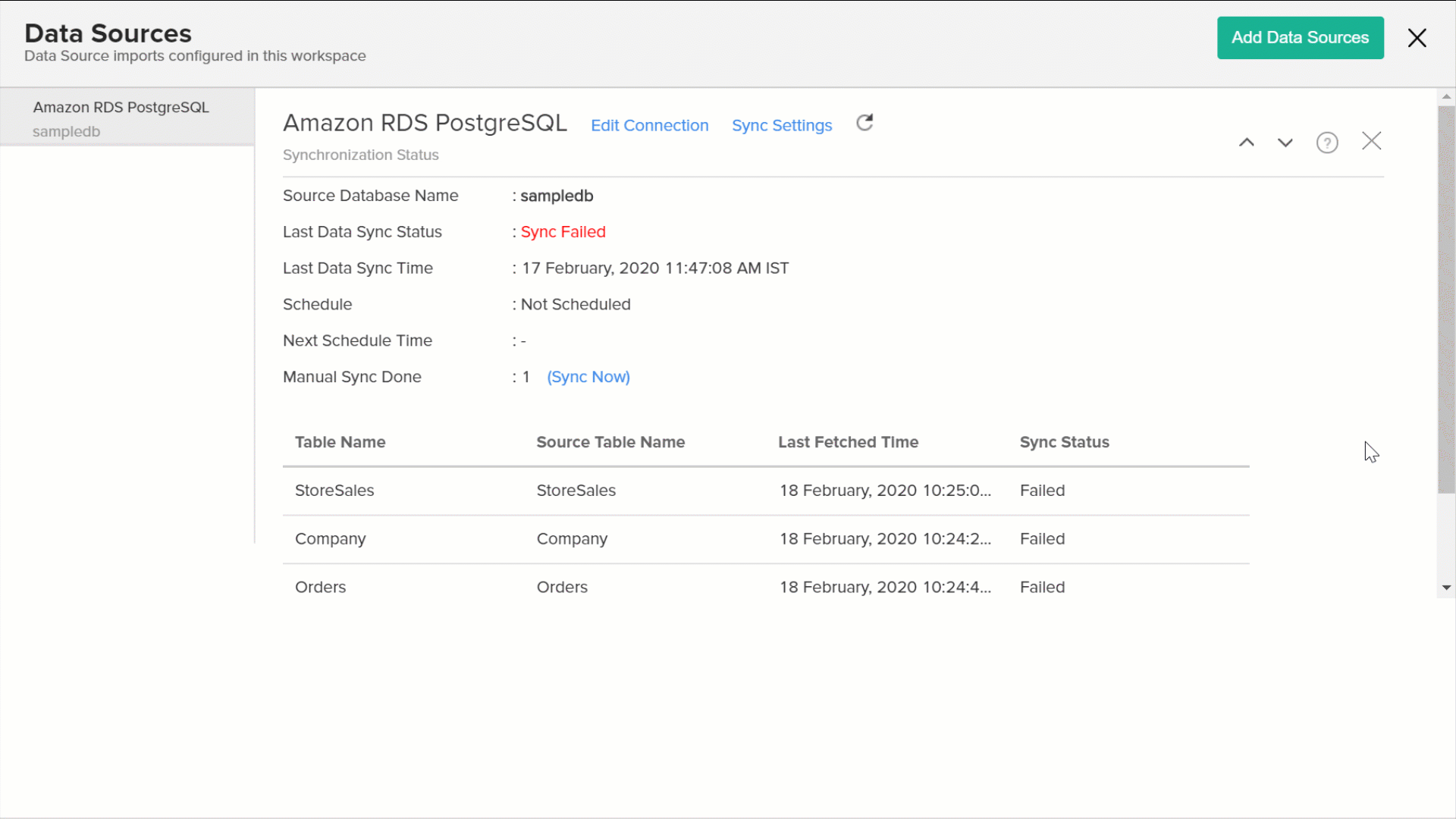 • Navigate to the required data source, and click the Sync option that appears on mouse over the required table name.