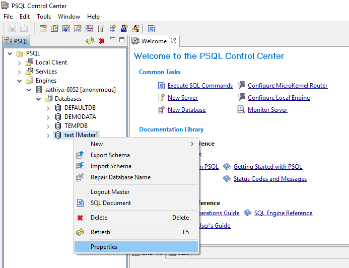 - Open the Pervasive SQL control center. Right-click on the engine name and click Properties.
