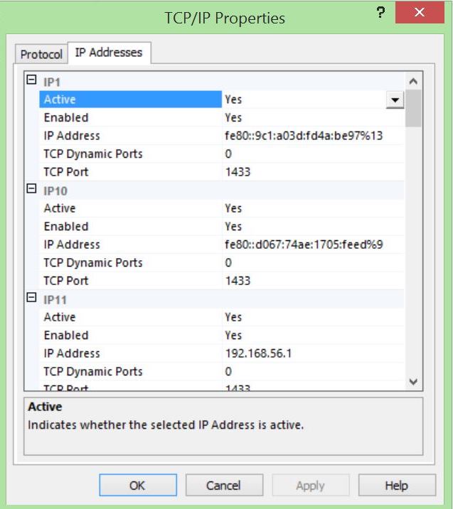 - Right-click on TCP/IP, navigate to Properties and head to the IP Addresses tab. Ensure the Active and Enabled fields are set to 'Yes', and configure the TCP/IP Port. Click OK to proceed.