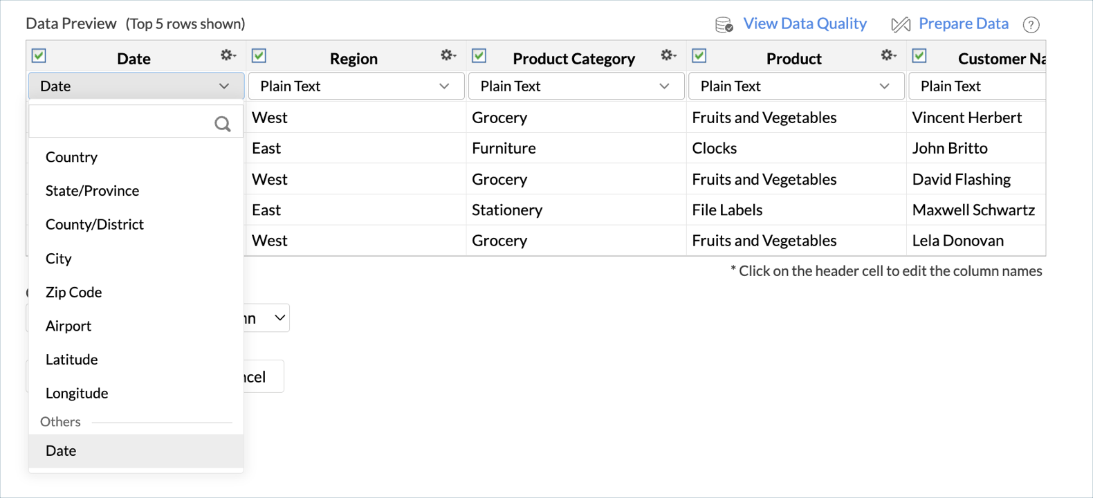 To change the data type, click the drop-down icon of the column and select the data type from the list.
