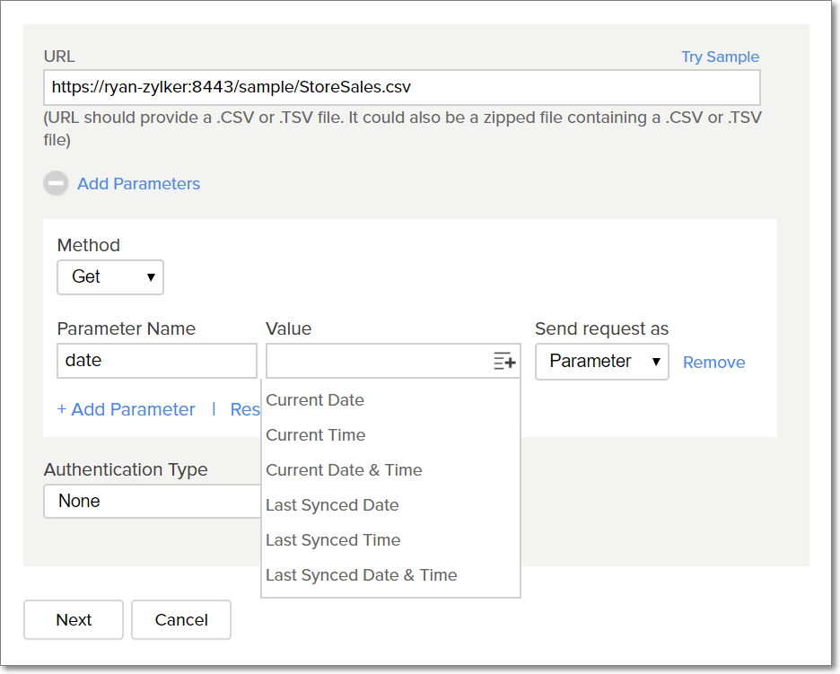 You can import data from a dynamic URL using parameters. If the URL from which data is being imported contains current date and time values, this can be filled using the Current Date, Current Time and Current Date & Time parameter value in the first step of the import process. This will import data from URLs that change dynamically based on the date.