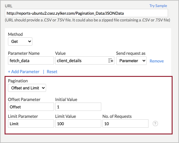 • Offset and Limit: This option allows you to import a large dataset into Analytics Plus in batches, using the batch size of each batch and the starting position.To use the option, provide the following details: