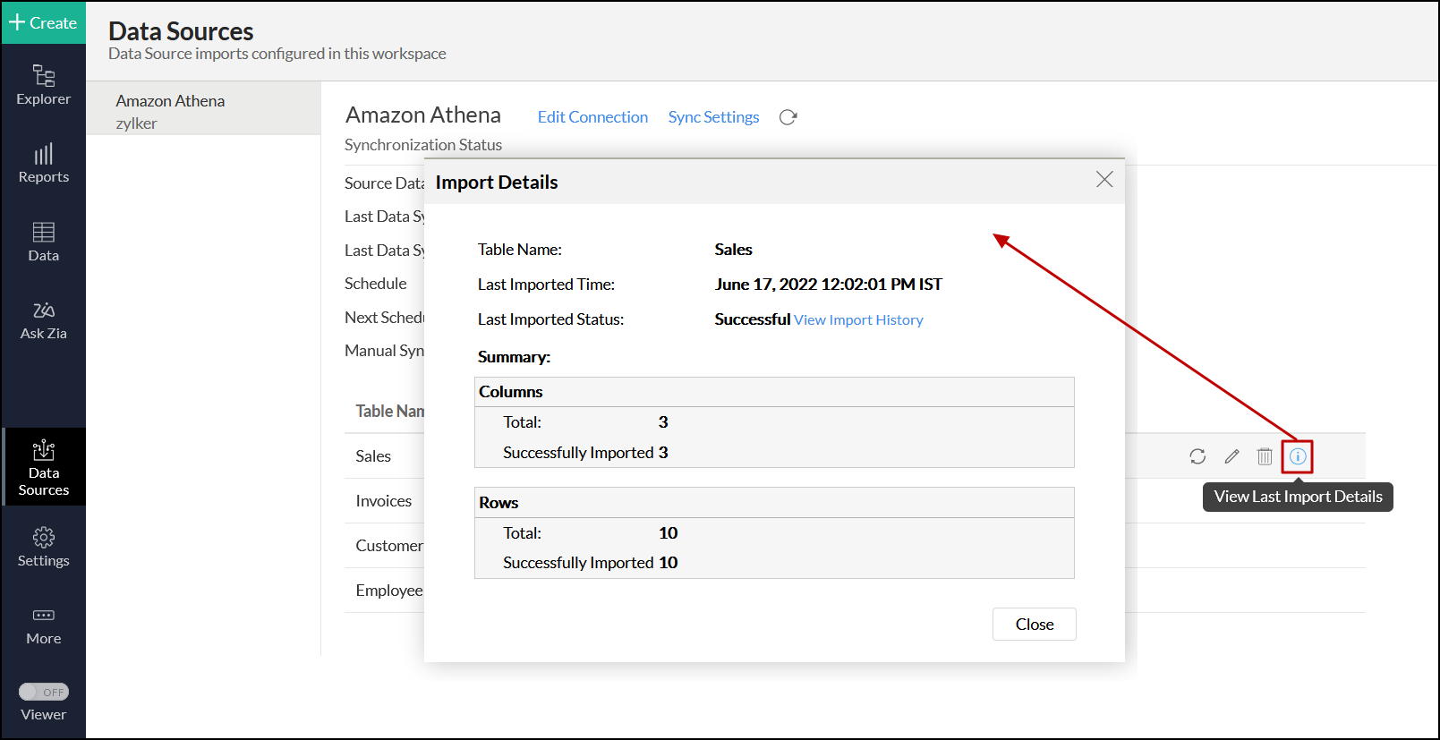Click the View Last Import Details icon that appears on mouse over the listed tables. This opens the Import Details page, which provides detailed insight on the reason for the synchronization failure.