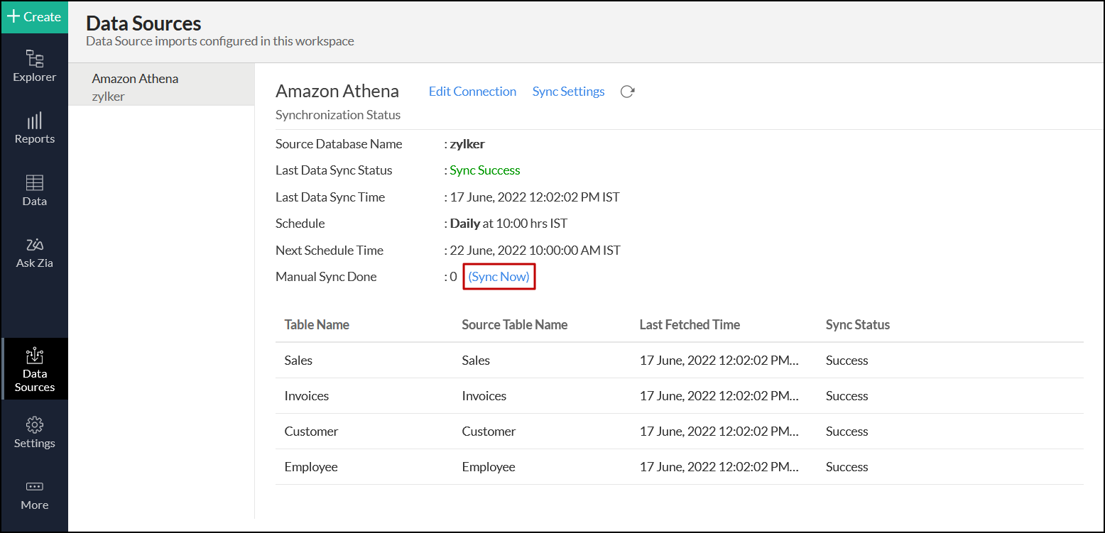 Navigate to the required Amazon Athena data source and click the Sync Now link.