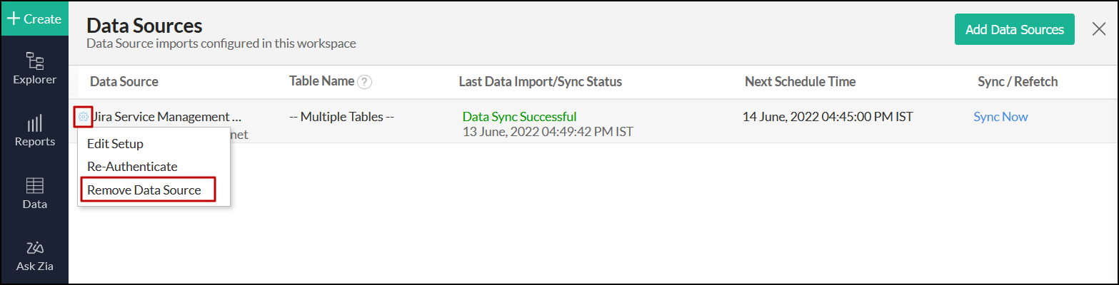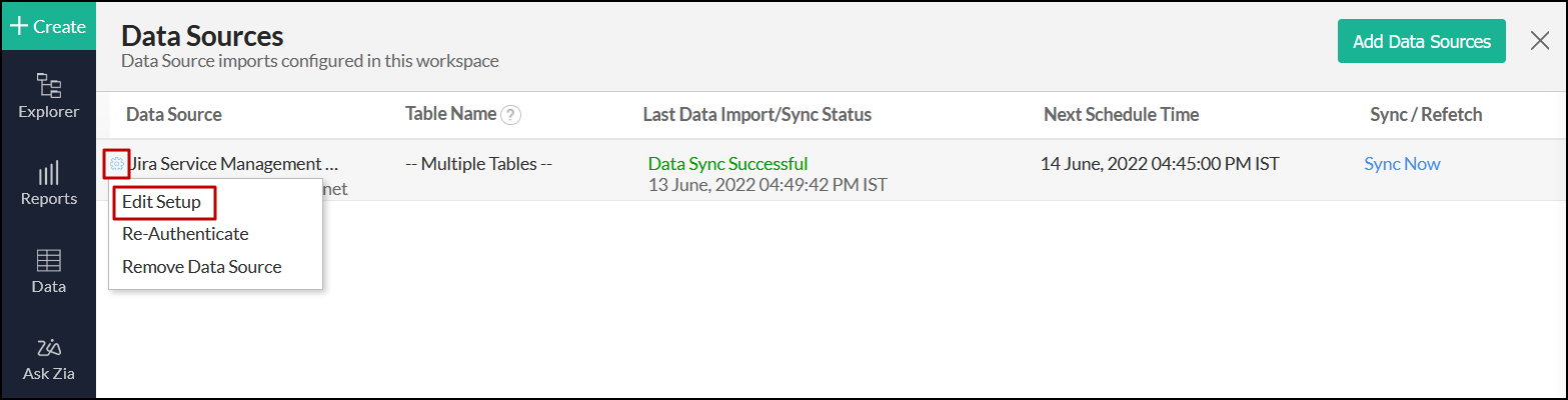 Click the Settings icon that appears on mouse over on the Jira Service Management Cloud data source and click the Edit Setup option.