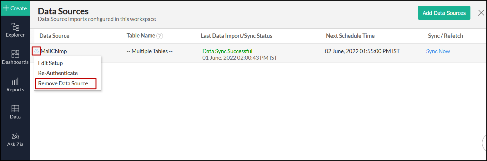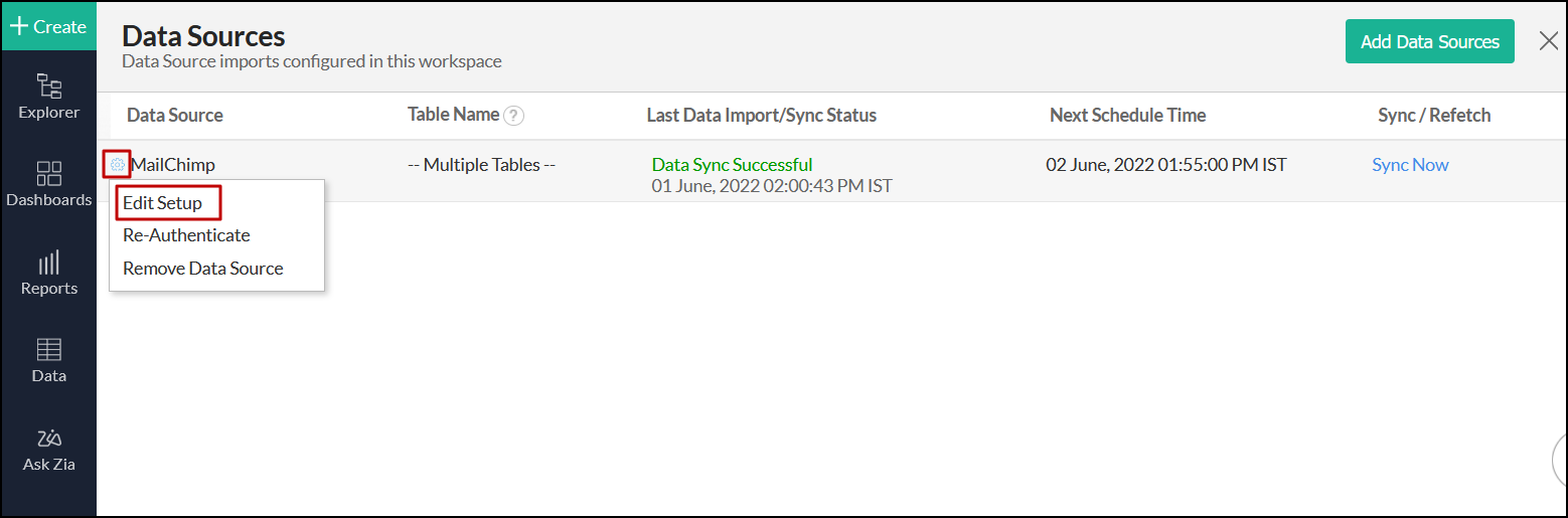 Click the Settings icon that appears on mouse over on the MailChimp data source and click the Edit Setup option.