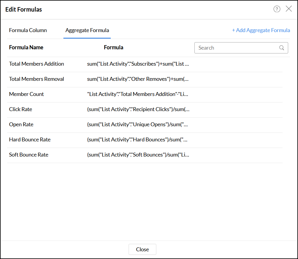 Formulas are calculations that can be defined using the powerful formula engine to create required reports. Refer this documentation to know more. There are also several default formulas created based on the MailChimp modules. To view the default formulas, open the required table, click Add and select the Edit Formulas option.