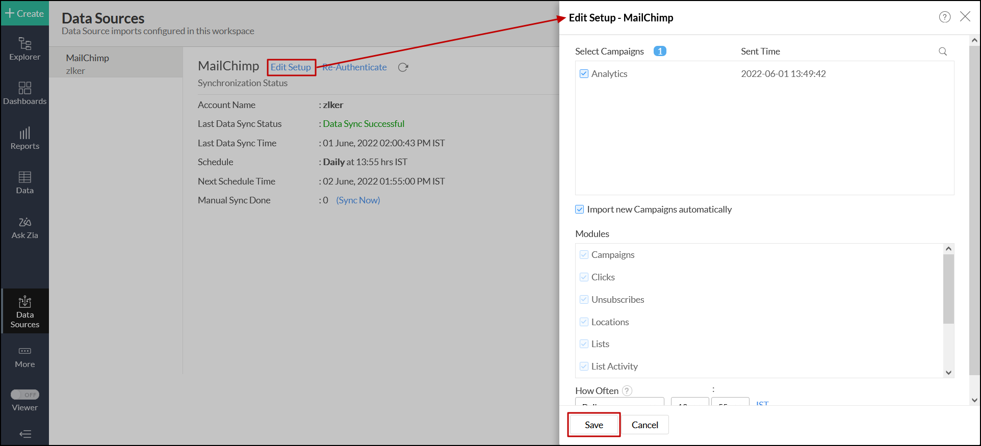 Navigate to the MailChimp data source, and click the Edit Setup link.