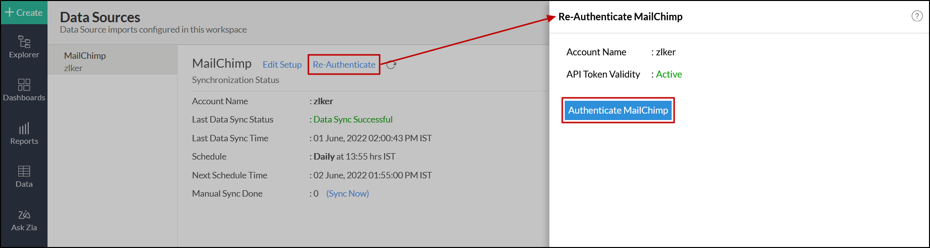 Navigate to the MailChimp data source, and click the Re-Authenticate link.