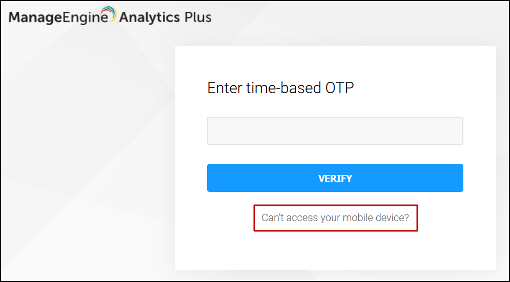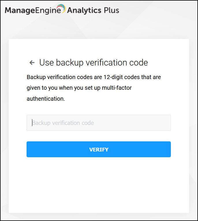 Note: Users will be locked out of their Analytics Plus account when the multi-factor authenticator configuration has been deleted in the authenticator application. Use backup verification codes to log in to your Analytics Plus account (Please write to us at analyticsplus-support@manageengine.com if you don't have one). Click here to learn more about backup verification codes.