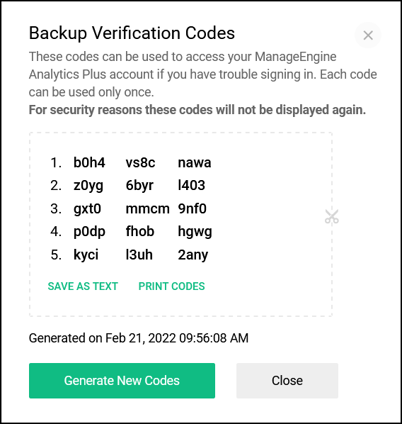 Backup verification codes prove beneficial when you are unable to log in using the one-time password generated from your authenticator application. You can generate five backup verification codes, and each of these codes can be used once to log in to Analytics Plus.