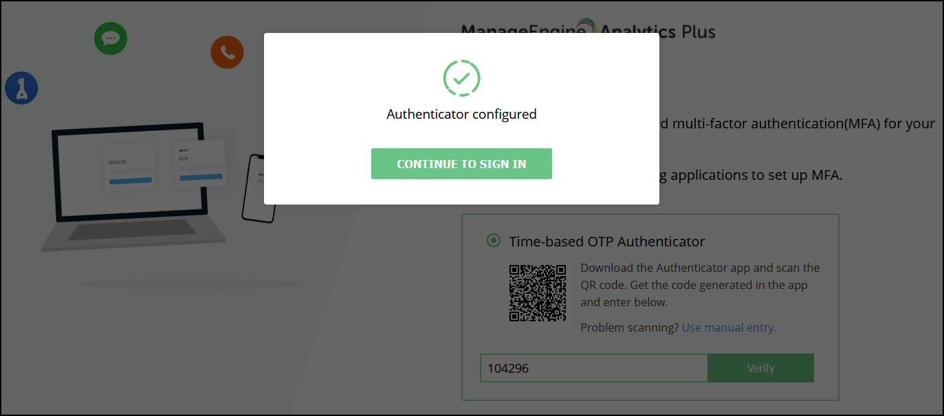 Multi-factor authentication (MFA) offers an additional layer of security for your Analytics Plus account. It works based on a time-based one-time password, which can be generated using any authenticator application. On enabling multi-factor authentication, every user who logs into Analytics Plus will need to provide an additional verification code during authentication.