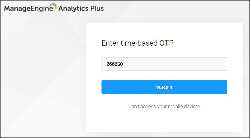 On successfully configuring multi-factor authentication, you will need to enter the one-time password generated in your authenticator app each time you login to Analytics Plus.