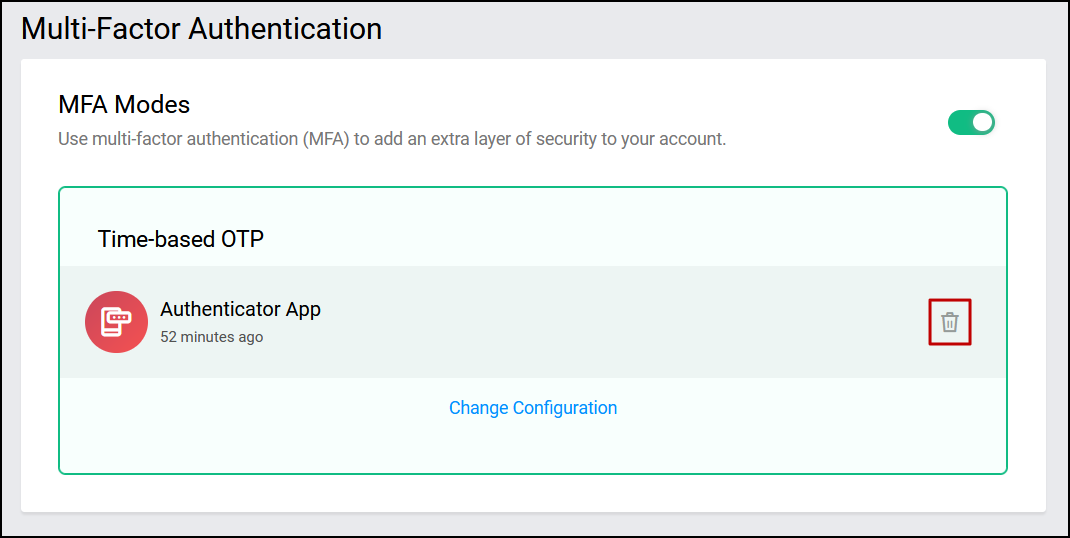 • Click the Delete icon that appears when hovering over the configured authenticator application.