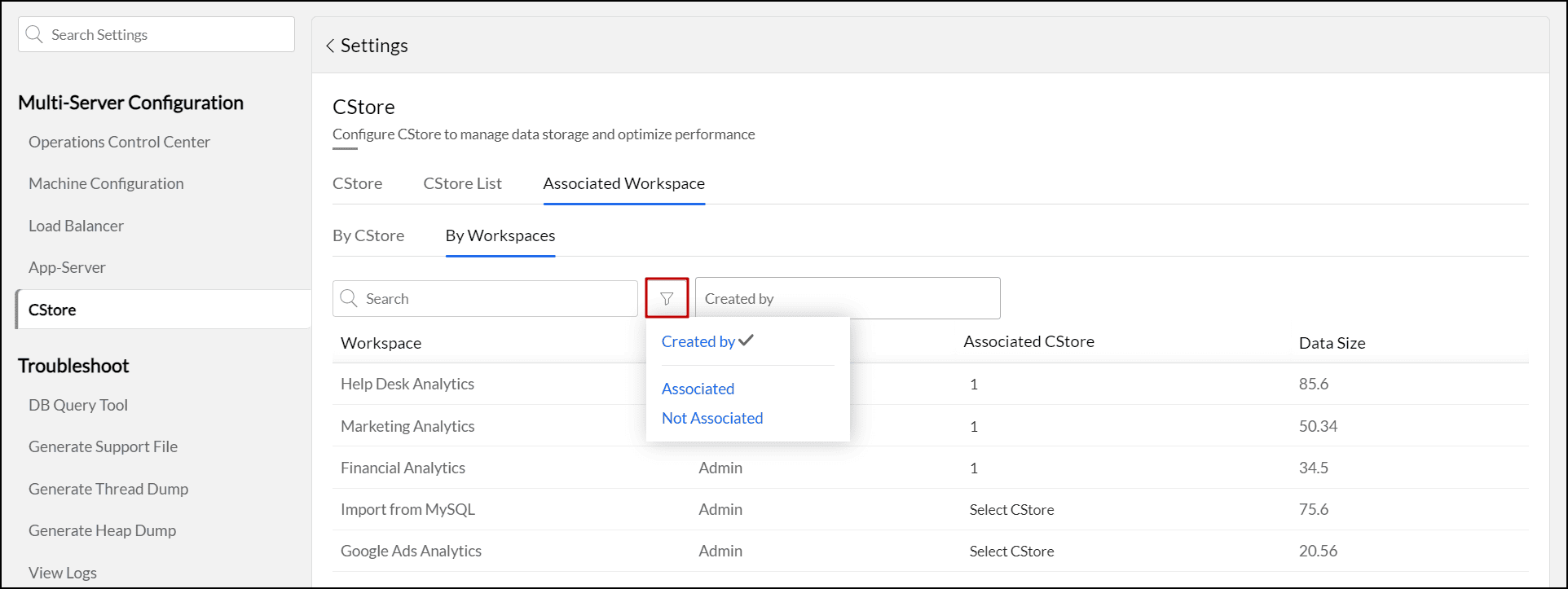 - On the CStore Configuration page, navigate to the Associated Workspace > By CStore tab. Here, you will find a list of all configured CStores.
