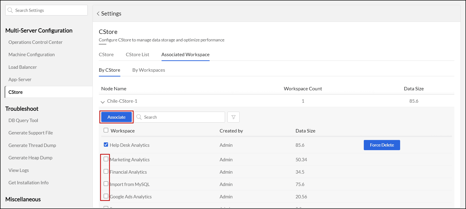 - All workspaces are automatically associated with the primary CStore by default. Therefore, the primary CStore node will not appear in the list for assignment to a workspace.