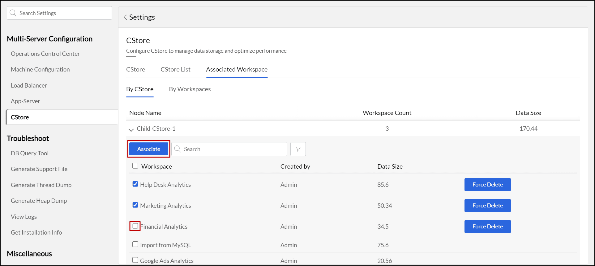 - The Associate Workspace tab will appear only if you have at least one child CStore configured in Analytics Plus.