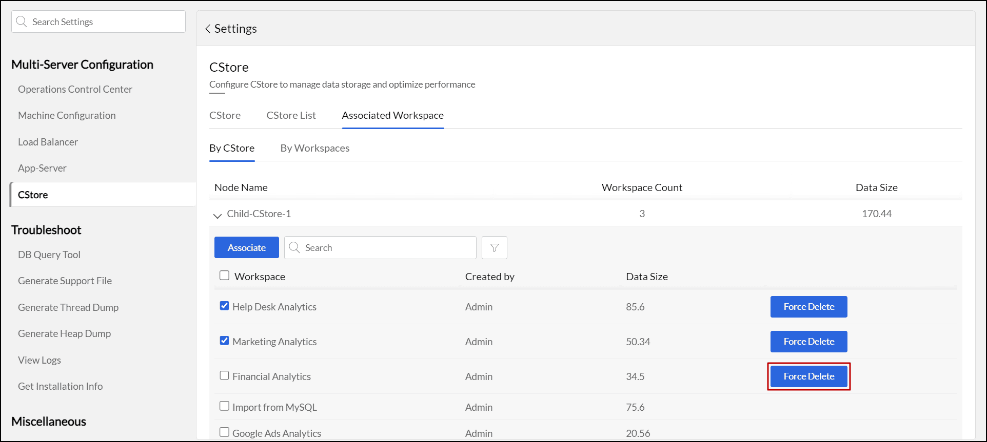 If you need to disassociate a workspace immediately, use the Force Delete option. The disassociated workspaces can be reassigned to the same or different CStore nodes.