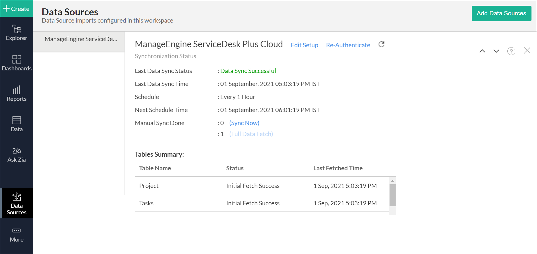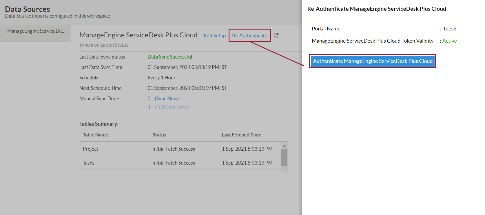 The import or synchronization process of your ServiceDesk Plus Cloud data can fail sometimes, due to a variety of reasons. To resolve this, click the Data Sources option from the side panel and click the Re-Authenticate link. In the popup that appears, click Authenticate ServiceDesk Plus Cloud