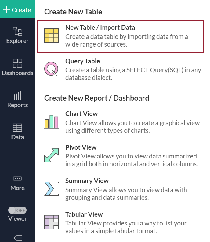 To do this, open the ServiceDesk Plus Cloud workspace, click Create from the side panel and select the New Table / Import Data option. You can integrate with other applications, or choose to import data stored in local filesweb URLslocal databasescloud databases and cloud drives. Click the corresponding links to know more.