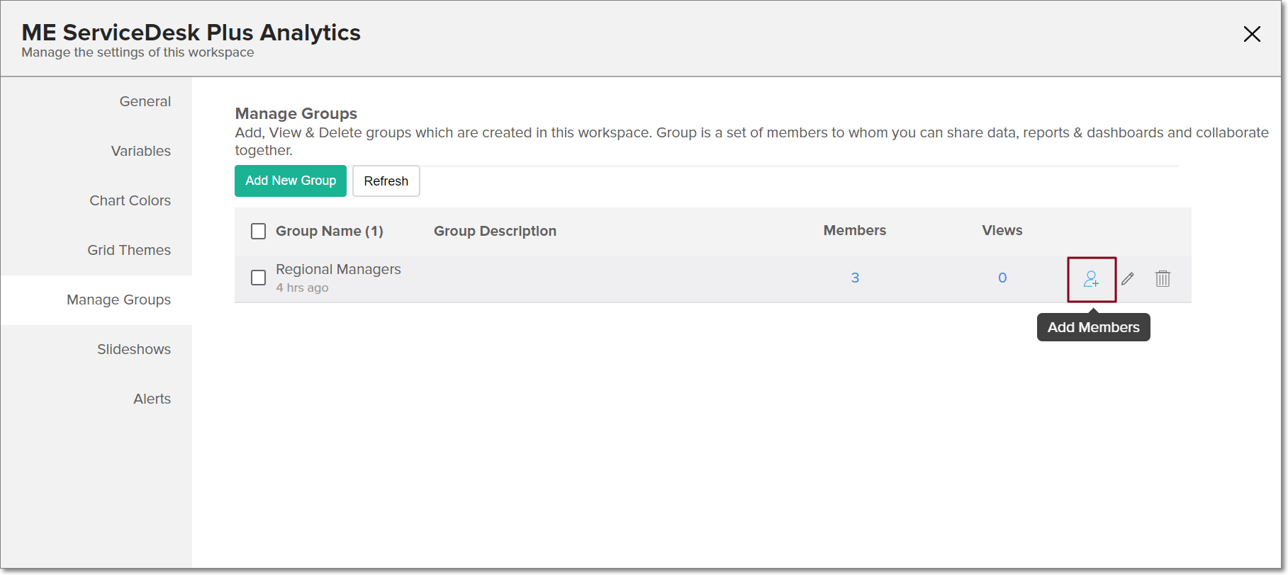 To facilitate easy collaborations, you can create Groups in Analytics Plus that contain a set of users. Reports and dashboards can then be shared to these groups, with the required permissions and filters applied. Any number of groups can be created within a workspace, and these groups are applicable only to the workspace they are created in.