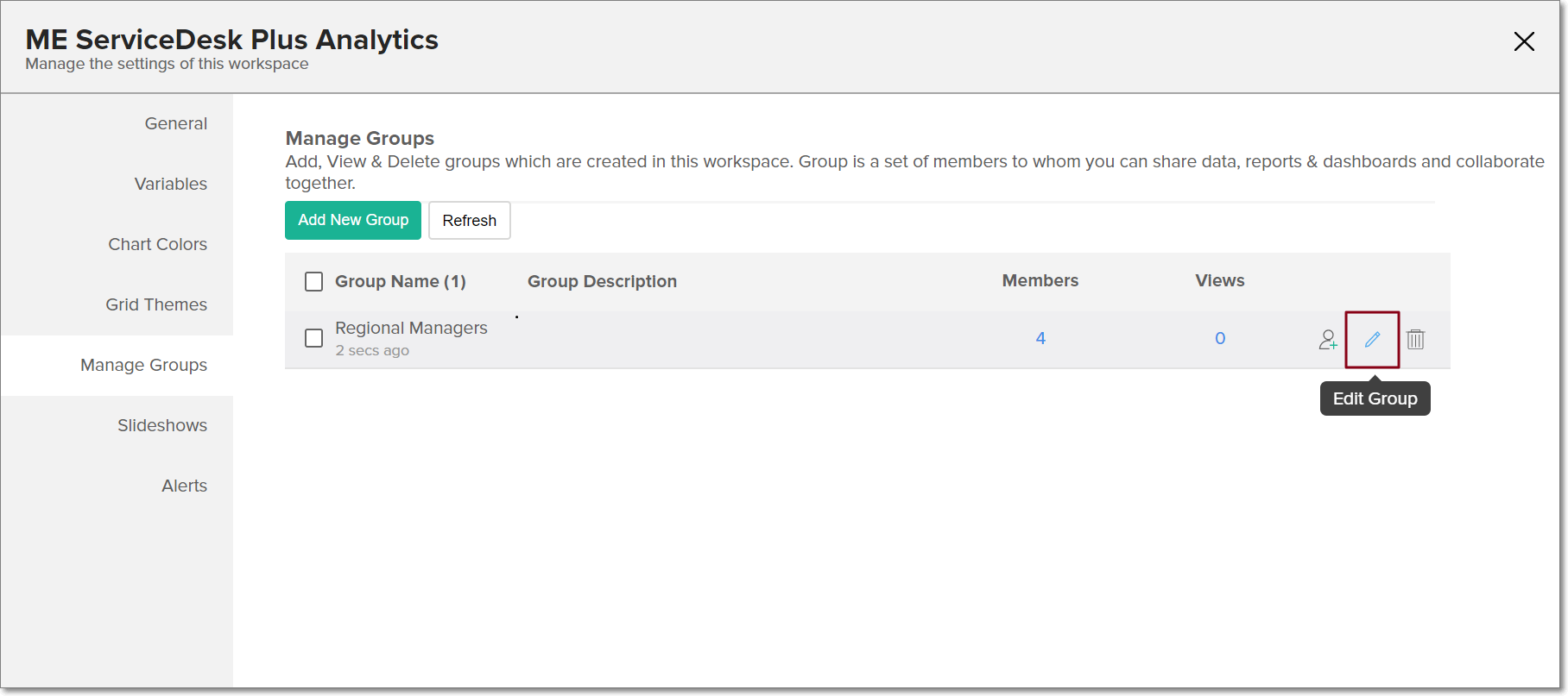 In the Manage Groups page, click the Edit icon that appears on mouse over the existing group.
