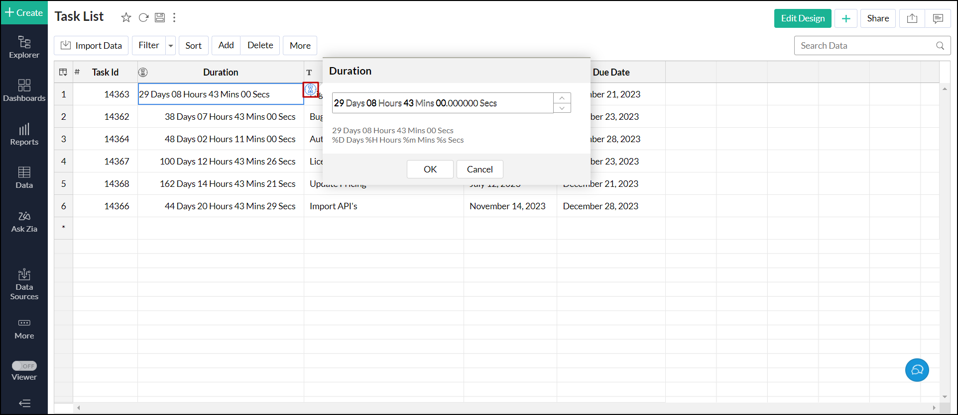 Note: While importing duration data into Analytics Plus, ensure the duration format is specified as in your source data. You can later change this in your table as required.