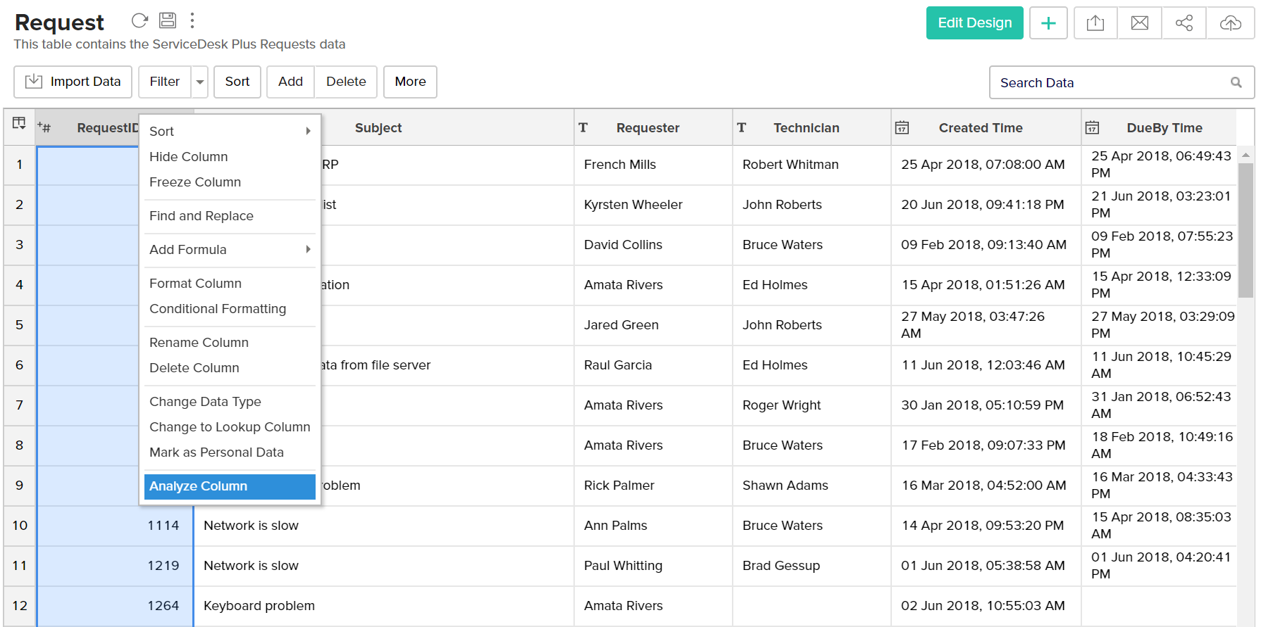 ManageEngine Analytics Plus can automatically analyze your column's data and create sample reports by picking meaningful metrics. You can get started with these reports or modify them or create your own. To analyze your column and create reports.