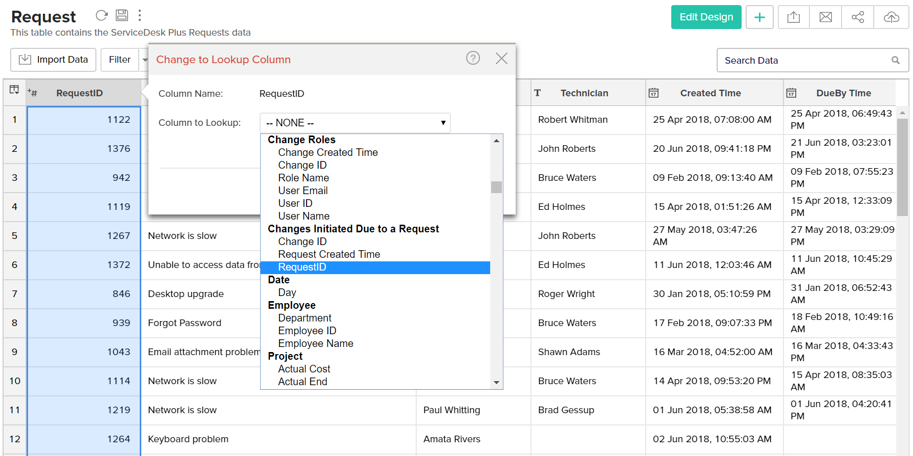 Lookup column relationships in ManageEngine Analytics Plus are similar to Foreign key relationships in Relational Database. A lookup column is a type of column whose values will be referenced from a column in another table in the same workspace i.e., it can be used to cross-reference tables in a workspace. Refer to the topics Relational Data Modeling and Joining Tables to know more about the lookup column.ManageEngine Analytics Plus provides you with an option to change a column to a lookup column. To change a column to a Lookup column:
