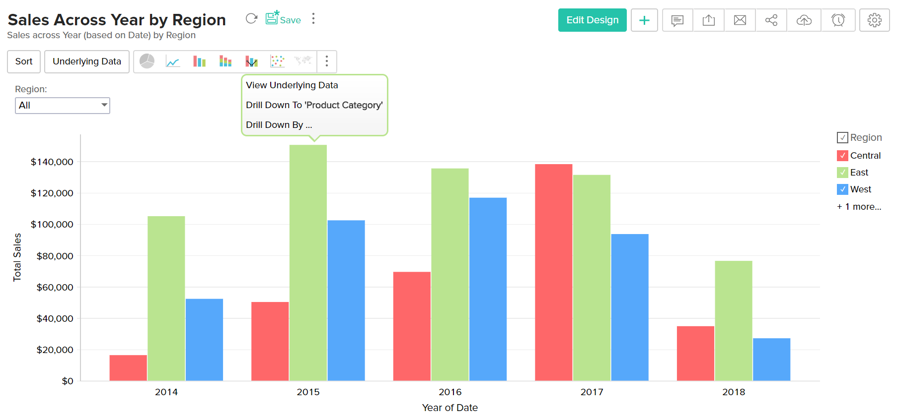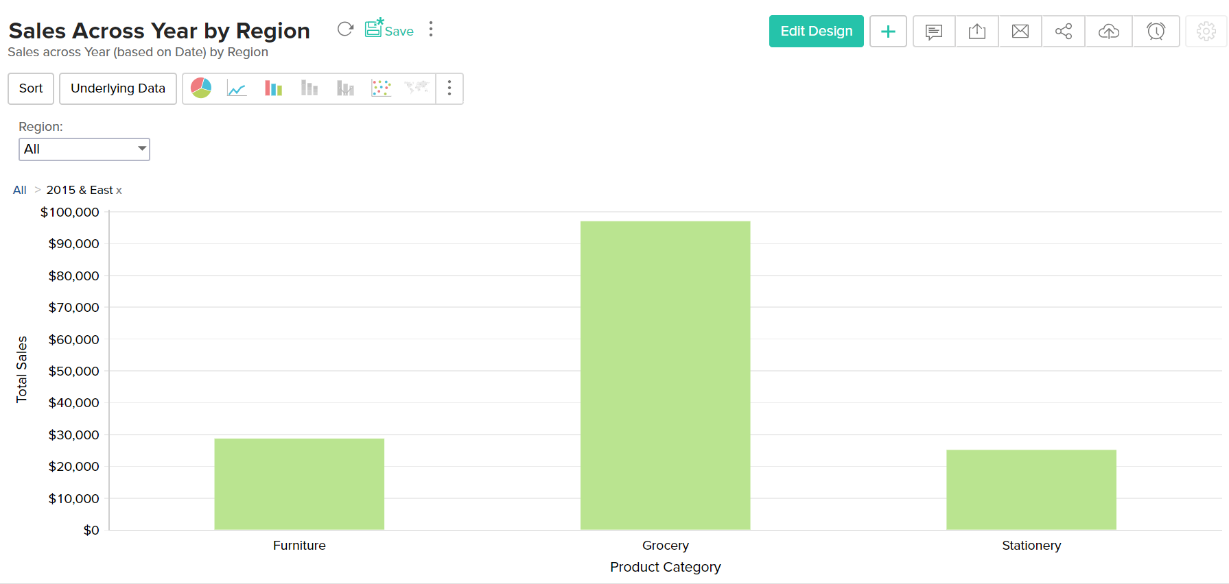 ManageEngine Analytics Plus allows you to drill down on your chart, enabling you to do powerful exploratory analytics. With this, You can click on any point in the chart and visualize the underlying data points as a new chart.